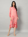 This pink floral print shirt dress features a flattering A-line silhouette with a cinched waist, button-down front, and long sleeves. Its vibrant floral pattern adds a touch of elegance, perfect for both casual and semi-formal occasions.